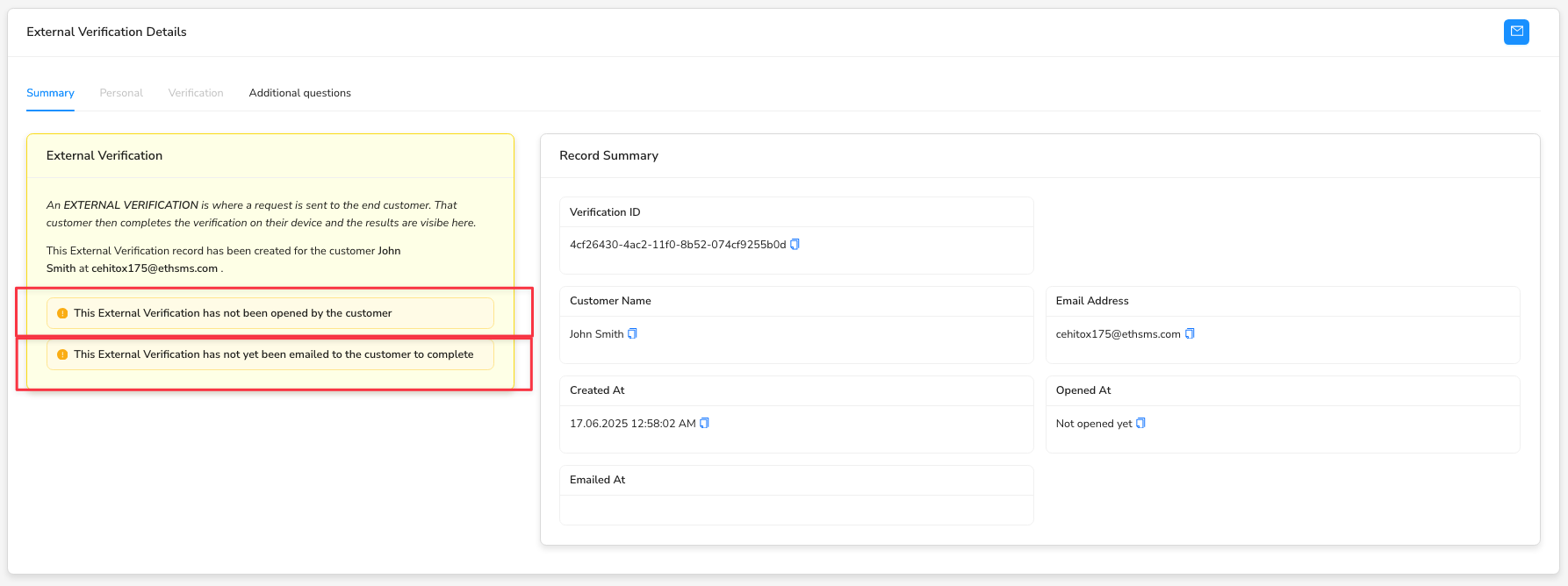 External Verifications now show clearly if they have been emailed to the customer and also if the end customer has opened the request.